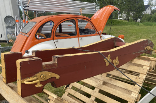 Albert Aarnes fikk hentet ned lavetten til en av kanonene på Christiansfjeld festning høsten 2024. Den måtte skiftes da treverket var råtnet. Nå holder Kjell Johansen og Albert på med å bygges nye deler slik at det snart er klart for maling av delene.